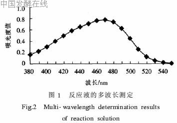 根据1.3.3节,用UV-1700型分光光度计对精氨酸与显色液的黄色反应液进行多波长测定。如图1所示,在470 nm处吸光值最大,因此,以470 nm作为反应液的测定波长。