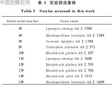 产油微生物在培养基中碳源充足而某些营养成分(特别是氮源)缺乏时,菌体细胞分裂速度锐减,代谢活动转为以消耗碳源并合成和积累油脂为主。在油脂积累期,微生物基本上不再进行细胞繁殖,而是将过量的碳水化合物转化为油脂[9]。因此,培养基中碳、氮源浓度及C/N比是影响微生物油脂含量的主要因素。葡萄糖通常是菌体细胞生长和油脂合成的最适碳源,因此首先以葡萄糖为碳源,在限氮条件下发酵培养,对10株潜在的产油酵母菌进行初步筛选,试验结果见表2,发酵结束时所测得发酵液中的残氮很低,基本接近于零(数据省略,下同)。