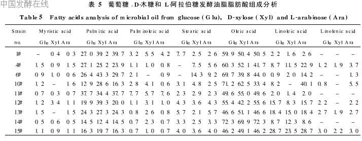 产油微生物胞内积累的油脂以甘油脂为主,在脂肪酸组成上与一般植物油脂相似,仍以C16、C18系脂肪酸,如棕榈酸、硬脂酸、油酸和亚油酸为主[15]。其它脂肪酸,如亚麻酸(GLA)、花生四烯酸(ARA)、二十碳五烯酸(EPA)、二十二碳六烯酸(DHA)以及一些特殊脂肪酸则存在于一些变异株中。产油酵母利用不同糖发酵的油脂脂肪酸组成分析结果(采用面积归一化法进行计算)如表5所示。