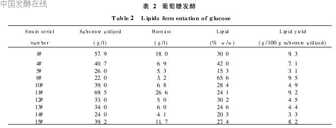 脂肪得率系数是评价产油微生物经济性的重要指标,脂肪得率系数越高,表明菌体对底物的利用效率越好。根据油脂生物合成途径分析,理论上每100g葡萄糖可产生约33g甘油脂,即脂肪得率系数为33。由于部分碳源要用于合成其它非脂类物质,实际上脂肪得率系数很少超过22[10]。文献报道利用卷枝毛霉和高山毛霉研究产油真菌油脂合成的生物化学过程时,其油脂得率系数为5.5和13.3[11]。利用深黄被孢霉在高糖培养基中生产单细胞油脂,在不同浓度的初始葡萄糖的批式发酵中得出的脂肪得率系数分别为16.6~20.1[12]。从表2中可以看出,在没有进行培养基及培养条件优化的情况下1#菌、6#菌和11#菌脂肪得率系数较高,达到9.0以上,15#菌脂肪得率系数达到8.2。