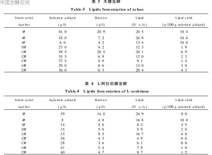 我们还以L-阿拉伯糖为底物进行了限氮摇瓶培养(表4),结果表明9株产油酵母都能利用L-阿拉伯糖并不同程度地积累油脂。其中1#菌油脂含量为24.9%,生物量为14.0/,脂肪得率系数9.0,进一步表明1#菌具有较宽的底物适应性。4#菌生物量较低,但脂肪得率系数达10.0,结果与2木糖相似。其它菌株对L-阿拉伯糖的利用能力均弱于对葡萄糖和D-木糖的利用。