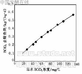 根据上述试验结果可得出该处理系统BOD5去除负荷与相应的出水浓度大致呈直线关系,如图4所示。根据生物处理反应动力学: