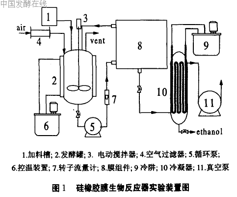 乙醇作为一种可再生燃料资源引起了广泛关注,这不仅是因为石油储量的日益减少,更是由于乙醇比石油类燃料更环保。发酵法生产乙醇是一个产品抑制过程,连续移走产物乙醇可减弱甚至消除其抑制作用,得到较高的乙醇体积产率。目前所采用的原位分离技术有:真空蒸馏、吸附、萃取、膜蒸馏以及渗透汽化等。其中渗透汽化与乙醇发酵耦合因其低耗高效且对细胞无毒害而受到国内外许多学者的重视和广泛探讨。Mori等人[1]利用PTFE-silicone平板膜构成的渗透汽化膜生物反应器进行直接用未经蒸煮的淀粉为原料的乙醇间歇补料发酵。与传统发酵相比,淀粉利用率大大提高,乙醇产率增加2.25倍。但其选用菌种的乙醇生产能力较酿酒酵母低很多,故乙醇体积产率只有0.36g·h L- 。Ikegami等人[。]和Nomura等人[。]也都采用渗透汽化与发酵耦合系统,以工业用干酵母为实验菌种对乙醇连续发酵进行实验。由于选用的硅沸石膜对乙醇有很高的选择性,得到的乙醇产品浓度分别达到70% (wt)和98.2% (wt),但由于膜通量太小,且膜污染问题严重,在一定程度上限制了其向更大规模发展。本实验室通过自制的平板PDMS复合膜组件及发酵系统来构造硅橡胶膜生物反应系统,使乙醇产率较传统间歇发酵有很大提高,且整个实验过程中未出现膜污染及膜性能下降等问题。此次在前期实验基础上进行放大实验,由前期圆形膜器扩大膜面积为矩形膜器,发酵规模也扩大了一倍。以相