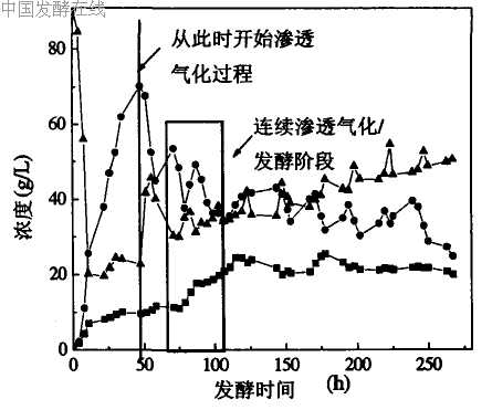 乙醇连续发酵过程的269h内,发酵罐中乙醇浓度保持在比较理想的范围50—30g/L,尤其在系统稳定后,基本维持在35—45g/L,这就保证了整个系统在较长时间内在低产物抑制的状态下稳定运行。前期实验[6]已证明,在发酵液复杂产物中乙醇产量比其它挥发性产物至少高3个数量级,分析计算时可将发酵产物看作只有乙醇,但长时间连续发酵一渗透汽化过程还是需要解决副产物积累对发酵的抑制问题。