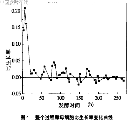 间计算得到酵母细胞比生长率随发酵及渗透汽化作用的进行而变化的情况如图4所示。在前25h内酵