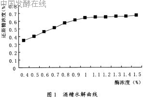 酒糟通常酸度很高,有时含有不溶性沉淀物,过滤除杂后,一部分可适合于糖化醪调酸,另一部分用于水解重新利用,调PH5.0,调温度为42℃。由图1可知,随着酶浓度的提高,还原糖的浓度也在不断地提高,但酶浓度添加到1%时,还原糖的浓度升高接近稳定并达到0.65%左右,因此在发酵中一般选择的浓度为1%。
