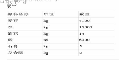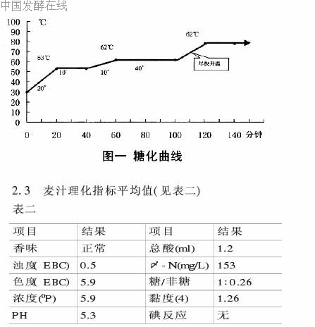 综合说明:原料使用一级加麦芽,生产全麦芽麦汁,以保证麦汁有足够的氨基氮,保证酵母生长需要。糖化采用30℃低温浸渍,53℃蛋白质分解,62℃糖化完全后,尽快升温到78℃过滤,洗糟水温76℃-78℃。糖化用水用酸和石膏调至PH5.2-5.4,以保证复合酶发挥最佳效果。酒花分两次添加,第一次麦汁初沸30分钟后加入8千克,第二次麦汁煮沸终了10分钟加入6千克,煮沸强度要大于8%。从表二麦汁理化指标平均值看,能够满足发酵的要求。