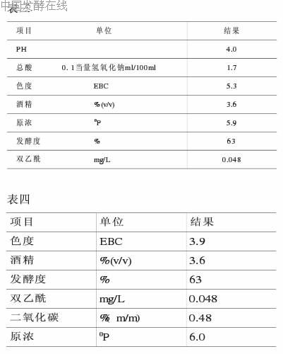 麦汁溶解氧含量要大于8ppm,入第一锅麦汁后添加酵母,满罐酵母数控制在1300万~1600万个/毫升。根据各厂啤酒口味要求不同,柠檬汁的添加量可增减,添加柠檬汁进入发酵罐发酵。麦汁满罐后要及时排渣,满罐温度为8℃,执行8℃恒温发酵,当外观糖度降为3.0°P时,开始保压并升温到12℃,进行双乙酰还原,当双乙酰降到0.06毫克/升时,降温到0~1℃贮酒,贮酒时间要大于7天,贮酒压力为0.08~0.10Mpa。后酵液理化指标见表三。