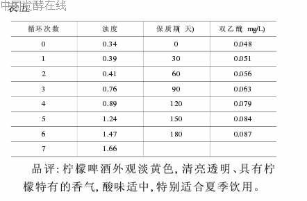 取柠檬啤酒放入啤酒保质期实验仪水浴中,0℃贮存24小时后,测浊度,记为初始浊度,加热到60℃,贮存24小时,再降温到0℃,测其浊度。如此循环,直到浊度升到1.5EBC时为止。每个循环相当于保质期30天。测试结果见表五
