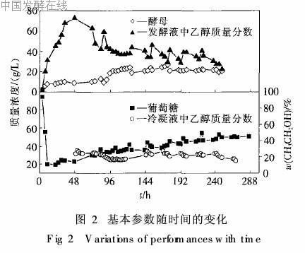实验过程中,酵母细胞利用葡萄糖在厌氧条件下生长,同时生成大量的代谢产物。PDMS膜通过渗透汽化过程,将乙醇从发酵液中原位分离,消除其对产物的抑制作用,使发酵反应连续循环进行。本实验的主要研究目的,是在适宜的温度下扩大实验规模,延长实验时间,考察基本参数的变化规律。