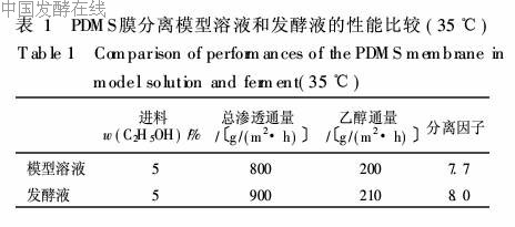 表1比较了同温度下PDMS膜分离相同进料质量分数的乙醇-水模型溶液与发酵液的性能,后者总渗透通量、乙醇通量和分离因子分别提高了12·5%、5%和4%,说明连续发酵与渗透汽化的耦合能够强化渗透汽化性能。伍勇等人[12]认为是活性细胞的存在强化了膜的传质过程,但此现象可能还存在其他原因有待进一步研究。