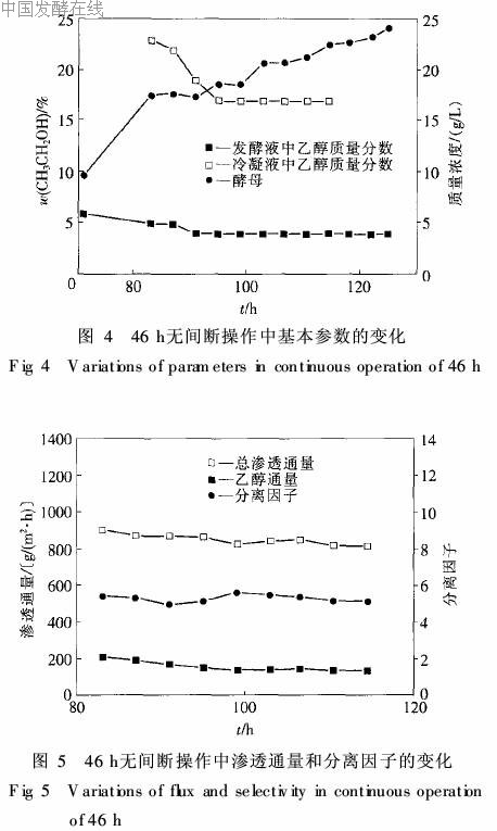 图4、5是为了研究本耦合系统在工业生产上的连续性和稳定性,在细胞生长稳定期内进行的46 h无间断操作。由于PDMS膜连续分离酵母细胞的代谢产物,进料乙醇质量分数逐渐降低,稳定在5%左右;产物抑制作用消除,酵母质量浓度持续升高,达到24·3 g/L;渗透侧乙醇质量分数开始逐渐降低,然后稳定在17% ~25%;渗透通量随之降低,总通量稳定在820~900 g/(m2·h);乙醇通量稳定在210~150 g/(m2·h);分离因子较为平稳,维持在5~6;这段时间的乙醇产率达到3·47 g/h。系统性能参数都稳定在一定范围内, PDMS膜的分离性能稳定,没有堵塞污染等现象,这说明连续发酵-渗透汽化耦合系统的连续工作性能稳定,可以获得较高的生产效益。