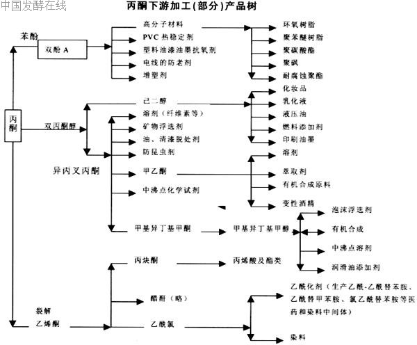 我国从1956年开始生产丙酮,当时采用发酵法,即以玉米或其他农副产品为原料,经过生物发酵得到丙酮、乙醇和丁醇,也称总溶剂法。