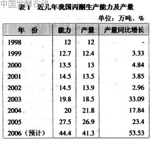 2005年全国丙酮(异丙苯法联产法)总能力增加到27.5万吨,生产量约26.9万吨,开工率97.8%。1998—2005年7年生产能力和产量年均增长率分别为12.6%和12.2%。预计2006年全国丙酮(异丙苯法联产法)总能力将达44.4万吨,生产量约41.3万吨,开工率93.0%。近几年我国丙酮生产能力及生产量情况见表1。