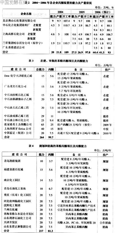 1995年前,我国丙酮生产企业曾多达50多家,但大部分企业采用发酵法,异丙苯法仅北京燕山石化公司、吉林石化公司、上海高桥石化和兰州石化公司4家。由于发酵法丙酮的经济效益比异丙苯法差,几乎全部停产,仅有个别地区自产自用或溶剂回收,估计有2—3套装置开车,生产量约0.1多万吨,略不计。表2列出2004~2006年各企业丙酮装置的能力及产量状况。