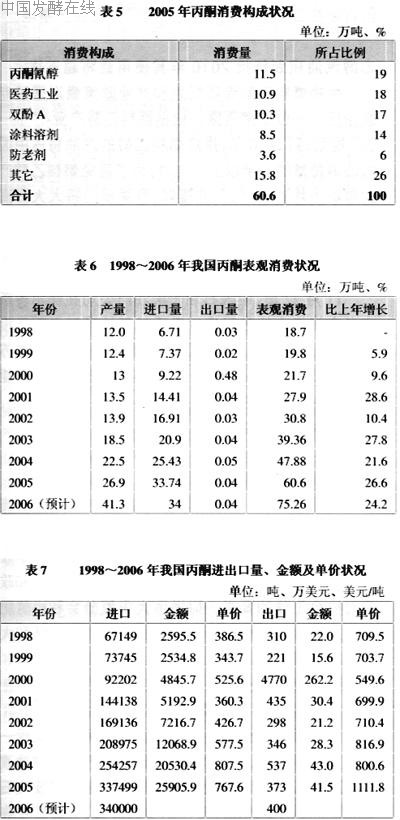 2005年我国丙酮表观消费量约60.6万吨,1998~2005年7年间,我国丙酮表观消费的年均增长率为18.3%,2005年较上年同比增长26.6%。无论是年均增长率还是同比增长,增长速度都较快。