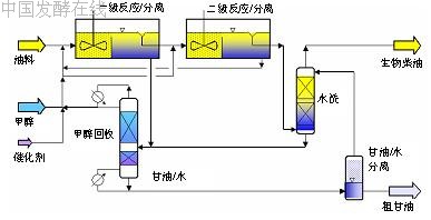 在研究基础上,多种以油脂为原料用化学反应的方法生产脂肪酸甲酯的工艺都得到开发和应用。从工艺步骤讲,有一步与多步反应工艺之分;从工艺操作看,有间歇操作与连续流动之别;依工艺条件分,有常压与加压之差;从催化体系看,还有均相催化和非均相催化之不同。图2为一较典型的两步酯交换法工艺流程示意图[7]。两步法的主要特征是在第一步酯交换反应的基础上,增加一次酯交换反应过程从而保证近乎100%的反应转化率。