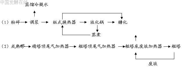 一是利用一、二级冷凝器排放的65℃左右冷凝水来粉碎、调浆;二是利用105℃的酒糟醪液来预先加热粗塔入料,在节约用水的同时节约能耗。