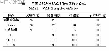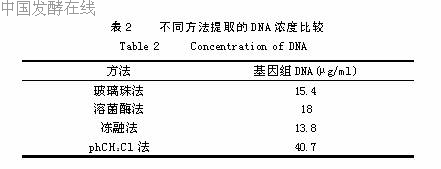 准确分析啤酒发酵液中微生物的种类,依赖于提取DNA的质量、产量和多样性,而三者的获得是建立在对细胞完全裂解和DNA充分释放的基础上。不同的提取方法,细胞裂解程度各异。玻璃珠法裂解酵母菌效率在90%以上;溶菌酶法、冻融法对酵母菌的裂解效率不到30%,而对细菌的裂解却能达到99%以上;phCH2Cl法对酵母菌和细菌细胞的裂解效率均达到100%(见表1)。