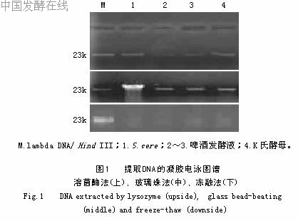 1.2.1DNA提取方法取发酵10d的啤酒发酵液1ml,4℃ 12000r/min离心3min,收集菌体;其它菌取培养16h菌液1ml,同样方法收集菌体。分别用玻璃珠法,溶菌酶法[5],冻融法[6],phCH2Cl法[7]提取DNA。玻璃珠法:0.5ml灭菌的高纯水(SDW)漂洗菌体一次,用200μl玻璃珠破菌缓冲液(20mmol/L Tris.Cl,10mmol/L MgCl2,1mmol/L EDTA,5%(V/V)甘油,0.3mol/L (NH)2SO4,pH7.9)重悬,加200μl(约0.3g)酸洗玻璃珠及200μl酚/氯仿/异戊醇(25:24:1),高速振荡3min;加200μl TE缓冲液(10mmol/L Tris.Cl,1mmol/L EDTA,pH8.0),快速振荡,高速离心5min;吸出上清液,加1ml冷的无水乙醇,颠倒混匀,室温下高速离心3min,弃上清;沉淀中加0.4ml TE缓冲液,30μl 1mg/ml RNA酶A ,混合,37℃温育5min;10μl 4mol/L的NH4Ac,1ml无水乙醇,颠倒混匀,室温下高速离心3min,弃上清;干燥沉淀;加100μl TE缓冲液;-20℃保存备用。