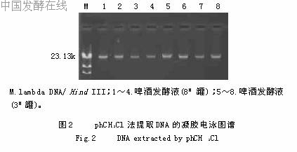 4种不同方法提取的啤酒发酵液DNA经0.8%的琼脂糖凝胶电泳,检测结果表明除冻融法,其余3种方法得到的DNA均大于23kb、无拖尾、无蛋白污染。phCH2Cl法图谱更清晰,几乎没有降解(图1、2)。