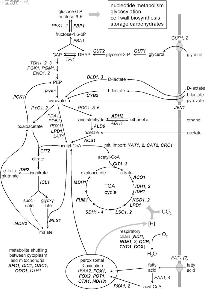 which positively affects longevity. This review describes the mechanisms of genetic control required for adaptive utilization of nonfermentable carbon sources by S. cerevisiae. Together with a consideration of carbon flow and the genes/enzymes affected by the carbon source, the current knowledge on signal transduction, regulatory factors, DNA-binding proteins and their recognition of specific sequence motifs which finally lead to transcriptional repression, derepression or induction are presented. Although transcriptional control is in the focus, a distinct mechanism of carbon source regulation (stability of individual mRNAs) is also considered. Related reviews have been published by Ronne (1995), Entian and Schu¨ ller (1997), Gancedo (1998) and Carlson (1999). Nonfermentable substrates must be used for the oxidative metabolism of mitochondria (ATP production) and for the regeneration of sugar phosphates(gluconeogenesis), being substrates of nucleotide biosynthesis, glycosylation, cell wall generation and the biosynthesis of storage carbohydrates. Glycerol entersthe glycolytic pathway at the level of triose phosphate (dihydroxyacetone phosphate; DHAP), which is converted into pyruvate to some degree but also allows production of glucose-6-phosphate. Following its uptake and oxidation to pyruvate, a similar metabolic flow is effective for lactate. Routinely, ethanol produced in the course of alcoholic fermentation is re-introduced into the metabolism via its oxidation and the subsequent biosynthesis of acetyl-CoA. Acetyl-CoA is also generated directly by the peroxisomal b-oxidation of fatty acids. Metabolic pools of acetyl-CoA are required for various pathways, among which the cytoplasmic glyoxylate cycle and the mitochondrial tricarboxylic acid