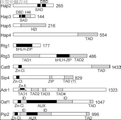 Fig. 2 DNA-binding factors and transcriptional activator proteins of structural genes involved in nonfermentative metabolism of S. cerevisiae. Due to substantial length variations (lengths are given in amino acid residues, at the right), different regulators are not shown to the same scale. As a result of the varying resolution of molecular an