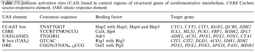 which may be controlled by the differential biosynthesis of the respective permeases. Thus, several pathways with partially opposite metabolic fluxes require a complex pattern of gene expression, allowing optimal adaptation to the most convenient substrate available in a certain situation. Consequently, distinct upstream activation sites (UAS) are involved in the transcriptional regulation of structural genes required for respiration, retrograde control of nuclear genes in the case of mitochondrial dysfunction, gluconeogenesis and oleate induction of peroxisomal functions (summarized in Table 1). Activator proteins which bind to these sequences strongly differ with respect to molecular architecture (cf. Fig. 2).