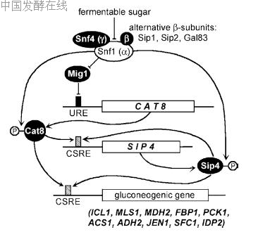 re a functional SNF1 gene. Indeed, Cat8 becomes phosphorylated in the course of the derepression of target genes (Randez-Gil et al. 1997). Since Snf1 recognition sites are apparently absent from the sequence, it remains unclear whether Cat8 is a direct substrate of the Snf1 kinase complex. Importantly, a chimeric CAT8 variant with a carbon source-independent promoter and a constitutive transcriptional activation domain fused to Cat8 allowed an almost glucose-insensitive expression of CSRE-driven genes (Rahner et al. 1999). Such a construct could bypass the need for a functional Snf1 protein kinase for growth with ethanol as the sole carbon source. Regulatory mechanisms shown for Cat8 are also effective for the less important CSRE-binding factor Sip4 (Lesage et al. 1996; cf. Fig. 6). SIP4 is responsible for the residual activation of a CSRE-dependent gene in the absence of CAT8 (about 15% of the maximal level of derepression; Hiesinger et al. 2001). Since derepression is completely abolished in a cat8 sip4 double mutant, no additional activators specific for CSRE motifs should exist; and overexpression of either SIP4 or CAT8 could suppress the mutant phenotype of the double mutant. Importantly, Cat8 is required for maximal expression of SIP4 (Vincent and Carlson 1998) and for effective activation by Sip4 (Hiesinger et al. 2001), arguing for some kind of autoregulatory cross-talk among both activators. Indeed, the SIP4 upstream region itself contains a CSRE variant, explaining the reduced transcription of SIP