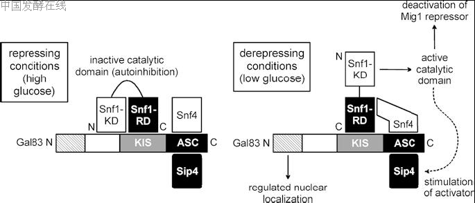 of Snf1 interact under repressing conditions (high glucose)but not under derepressing conditions, arguing for a carbon source-regulated autoinhibition of the protein kinase (Jiang and Carlson 1996). The SNF4 gene product