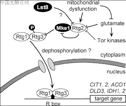 Fig. 5 Regulatory pathway of retrograde control. Signal-dependent nuclear translocation of the Rtg1+Rtg3 heterodimer is required for activation of R box-dependent target genes. Mks1 acts as an inhibitor of Rtg3, possibly by preventing nuclear translocation of the activator complex. Rtg2 counteracts inhibition by Mks1 by partial dephosphorylation of Rtg3. Rtg2 acts as a sensor of respiratory deficiency and availability of glutamate (both signals may coincide). Tor kinases may also act via Rtg2. The function of the negative factor Lst8 is poorly understood. P Phosphate residue, R box regulatory promoter element of retrograde control (upstream activation site UASr)