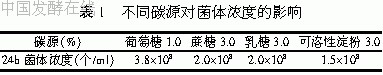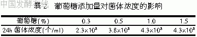 以葡萄糖为碳源,分别用0.3%、0.5%、1.0%、1.5%4个用量水平进行培养,基础培养基中其它成分保持不变。培养24h结果见表2。