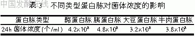 分别以1.0%的酪蛋白胨、胰蛋白胨、牛肉蛋白胨、大豆蛋白胨代替基础培养基中1.0%的牛肉蛋白胨,其它成分不变,培养24h,结果见表3。由试验可知1.0%胰蛋白胨的培养效果最好。