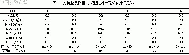 由试验可知无机盐及微量元素对菌体浓度的影响不大,而对芽孢转化率有较大影响。其中第5组无机盐及微量元素配比最佳。NaCl 0.2%、(NH4)2SO4 0.1%、 K2HPO4 0.4%、MgSO4 0.05%、MnSO4 0.02% 、NaHCO3 0.1%、 CaCO3 0.1%时芽孢转化率最大。