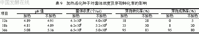 从试验结果可见,加热组的菌体生长最旺盛。而非加热组虽然芽孢形成较早,但最终得率不高,且菌体衰老较快。故判断加热可活化菌种。
