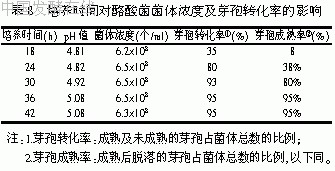 培养时间是影响菌体浓度及芽孢转化率的重要因素。本试验取不同培养时间进行观察,结果见表8。试验结果表明,培养时间过短,菌体浓度尚可,但芽孢转化率和成熟率都过低。但时间过长,芽孢转化率和成熟率并无明显提高,反而出现菌体老化,菌数下降的情况。试验表明36h为最佳培养时间。