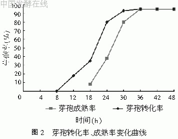 从观测结果可看出,培养过程中各参数的变化之间是有对应关系的。菌体生长与pH值的下降基本是同时开始的,当pH下降放缓直至最低点时,菌体生长到达指数期末,进入稳定期。芽孢形成在指数期就已经开始,在稳定期末芽孢转化率达到最大,培养36h后芽孢成熟率也达到最大。随着芽孢形成并逐渐成熟,pH有回升的现象,这主要是由于芽孢形成过程中,菌体组织分离脱落,使孢内碱性物质溶出,另外也与芽孢形成过程中菌体的代谢有关。