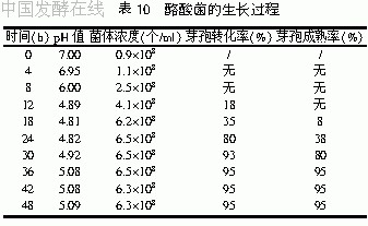将菌种于80℃加热10min后以10%的接种量接种于上述培养基中静置培养,对培养期间的菌数、pH值、芽孢转化率、芽孢成熟率等参数进行观测,结果见表10,图1,图2。