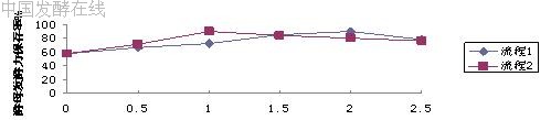 按照国家标准,产品的保存率是指在一定温度下,将样品放置一定时间后,所测得的发酵力与原样品发酵力之比的百分数为该样品的保存率[4]。本表中的数据是采用快速测定法测定的结果,即产品在47.5°C培养箱中放置一周(二周)等效于产品在常温下放置一年(二年)来测定。从表5中可看出,流程1和流程2的产品保存率是相同的。