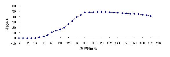 从图1可知发酵过程中大豆肽转化率随发酵时间增加而增加,在120h以后略有下降,在发酵96h后大豆肽转化率增加速率开始放慢,在120h达到最高点48.61%,从生产角度考虑,发酵时间定在96h,此时的大豆肽转化率达47.78%。