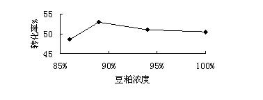 在2.1的基础上,分别考察原料中豆粕含量为86%、89%、94%和纯豆粕对转化率的影响,结果见图2。