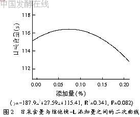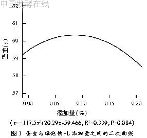 在本次试验中添加0.1%的维他快-L组,种蛋的合格率显著高于其它两个处理组(P<0.05),入孵蛋孵化率、母鸡健雏率、繁殖性能指数各组间虽然差异不显著,但添加0.1%的维他快组相对于其它两组还是有较大的提高趋势。日采食量、蛋重方面添加0.1%维他快组显著高于添加0.2%组,两个添加组与对照组差异都不显著,但添加0.1%维他快时还是有所提高。试验数据经过二次曲线分析,发现日采食量、蛋重和维他快的添加量存在二次曲线相关的趋势,最佳值出现在0.073%~0.086%之间。