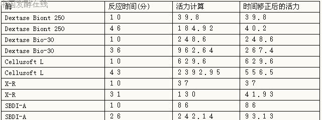 这组数据反映出;在酶的作用下,CMC的粘度随着时间的延长而不断下降,如此算出的活力当然是要大许多,但是经过时间修正(活力×给定/实际),与标准条件下检出的活力数据上下差不过10%左右。它说明二个问题;在一定时间内,酶对CMC的作用是;时间越长水解越多。②经过修正,不同时间测得的酶的活力,数据维持在同一个水平线上(注:CMC水解率太高时,粘度很小,粘度计测度误差加大)。