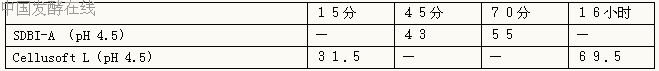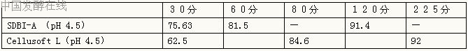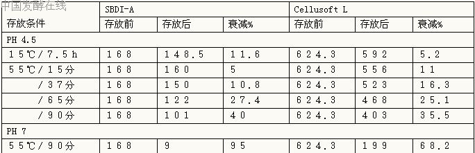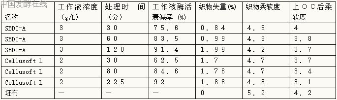 这里SBDI-A处理液的pH是4?5,Cellusoft L处理液的PH是4.5表中数据可以看出,后者,工作液中酶的衰减速度小于前者,另外二个处理液的浓度前者大于后者,但是从最终的处理效果来看(柔软剂处理后的织物)SBDI-A的120分钟与Cellusoft