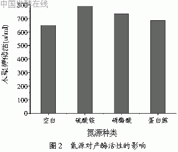 从图2可以看出,在添加氮源的培养基中,MB22菌发酵产木聚糖酶的活性显著高于不添加氮源时的对照培养基;而不同氮源对MB22菌产酶活性的影响分别是:添加无机氮源(NH4)2SO4时MB22菌产酶活性最高,添加NH4NO3次之,添加有机氮源蛋白胨时MB22菌产酶活性最低。