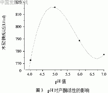 在上述碳源和氮源基础上,分别以pH4.0,pH5.0,pH6.0,pH7.0作为发酵培养基灭菌前起始pH进行MB22菌发酵产酶试验,其结果如图3所示。