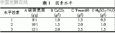 从表2可以看出:A2B2C2D3为本试验的最优水平组合,即碳源∶氮源=10∶1,CaCO3添加量为1.5g/l,Tween80添加量为2.0g/l,MgSO4·7H2O添加量为1.5g/l。