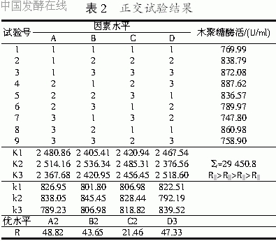 由极差分析比较即RA>RD>RB>RC可以看出:因素对MB22菌产木聚糖酶活的影响主次顺序是ADBC。即碳氮比例对MB22菌产酶活性的影响最大,其次是MgSO4·7H2O添加量、CaCO3添加量,而Tween80添加量对MB22菌产酶活性的影响最小。