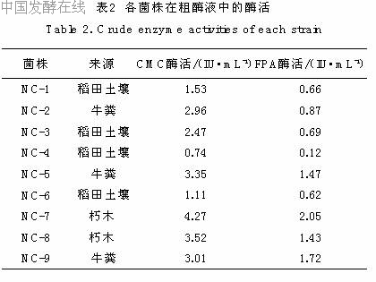 诱变程序:出发菌株→单孢子悬浮液→诱变处理→平板初筛→单菌落分离→5次摇瓶复筛(取平均值)→稳定性复筛。2结果与分析2.1菌株的筛选结果根据水解圈和菌落的直径比值及菌株的生长状况,从中筛选到了9株分解纤维素能力较好的菌,并分别进行划线分离、编号并保藏于固体斜面培养基上。这9株菌摇瓶复筛的结果见表2。其中编号为NC-7的菌株的CMC酶活和FPA酶活均要高于其他产纤维素酶的菌株,作进一步的研究。2.2NC-7菌株的鉴定结果