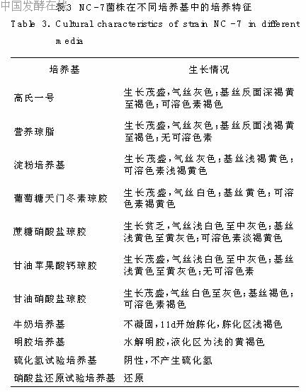 经显微镜形态观察,发现NC-7菌株的菌丝直径小于1μm,且菌丝呈现丝状分枝。未分化成孢子丝的菌丝无横隔。孢子丝是通过横割分裂的方式产生孢子,在成熟的孢子丝中才会出现横隔。从图1和图2可见,NC-7菌株的孢子丝呈现单轮辐射螺旋,菌丝向四周发散。周围分散的小球状的小点就是通过缢裂产生的成熟孢子。该菌株非常符合链霉菌的特征,因此鉴定为链霉属菌[8]。2.2.3NC-7菌株的生理生化观察根据NC-7菌株在不同的培养基中的生长情况,以及生理生化特征(见表3),初步鉴定NC-7菌株为链霉菌属中的生二素链霉菌(StreptomycesAmbofaciens)[8-10]。